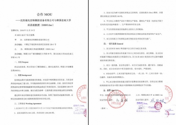 (주)대덕바이오 (대표 성창근, 충남대학교 농업생명대학 교수)는 중국 요녕성 심양 복광백 특수제어설비 유한공사(두굉우)와 지난 19일 요녕지구에 소나무 재선충병 방제를 실시하는 양해각서(MOU)를 체결했다.[사진=대덕바이오]