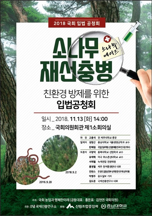 이번 공청회는 소나무 재선충병에 의한 전국적인 피해가 확산되고 있는 가운데, 소나무 재선충병 극복을 위한 법적 장치를 마련하고, 친환경 약제 개발을 통한 재선충병 발생 예방을 위해 다양한 의견을 수렴하여 이를 입법화하고자 관련 전문가 및 정부 관계자들과 함께 할 예정이다.